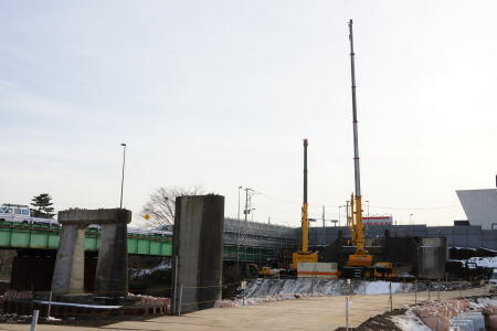 | 乾期となり架け替え工事が再開されて、橋台の撤去作業が行われています。近付いて見たいところですが、近付くことが出来ないため、100メートルくらい離れたところから撮った写真です。 |