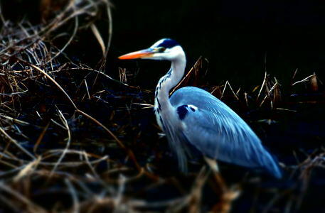 夕暮れが深まりつつある頃、川の浅い水辺にサギが舞い降り、チョコチョコと動き回り、餌となる小魚などを探している様子でした。 |